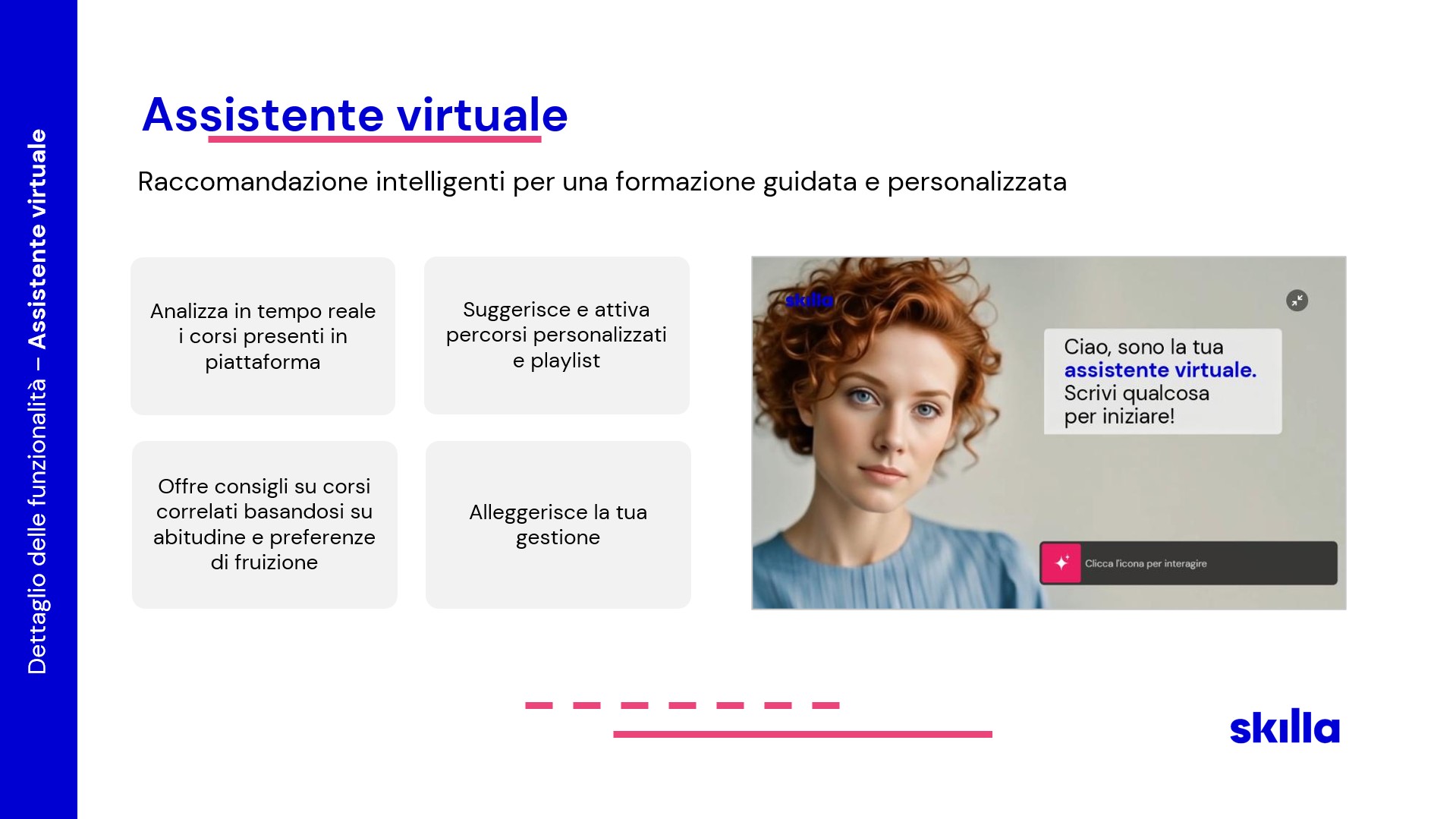 Sì, Skilla HUB integra un assistente virtuale intelligente che supporta gli utenti nella scelta e nella fruizione dei contenuti formativi, in caso di acquisto della Skilla Library, l’abbonamento al catalogo Skilla sulle soft e business skill.